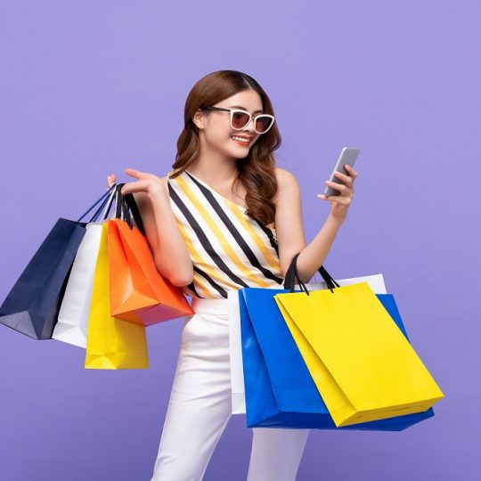 Trendy beautiful young Asian woman carrying colorful bags shopping online with mobile phone isolated on purple background